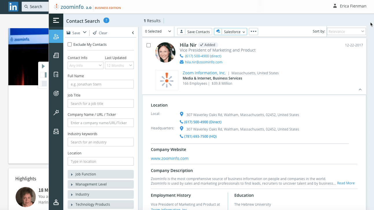 Mit der ReachOut-Erweiterung von ZoomInfo lässt sich die Prospektion einfach und schnell vereinfachen. Erhalten Sie direkte Telefonnummern und E-Mail-Adressen, während Sie LinkedIn-Profile, Unternehmenswebsites oder Leads, Accounts und Kontakte in Salesforce anzeigen.