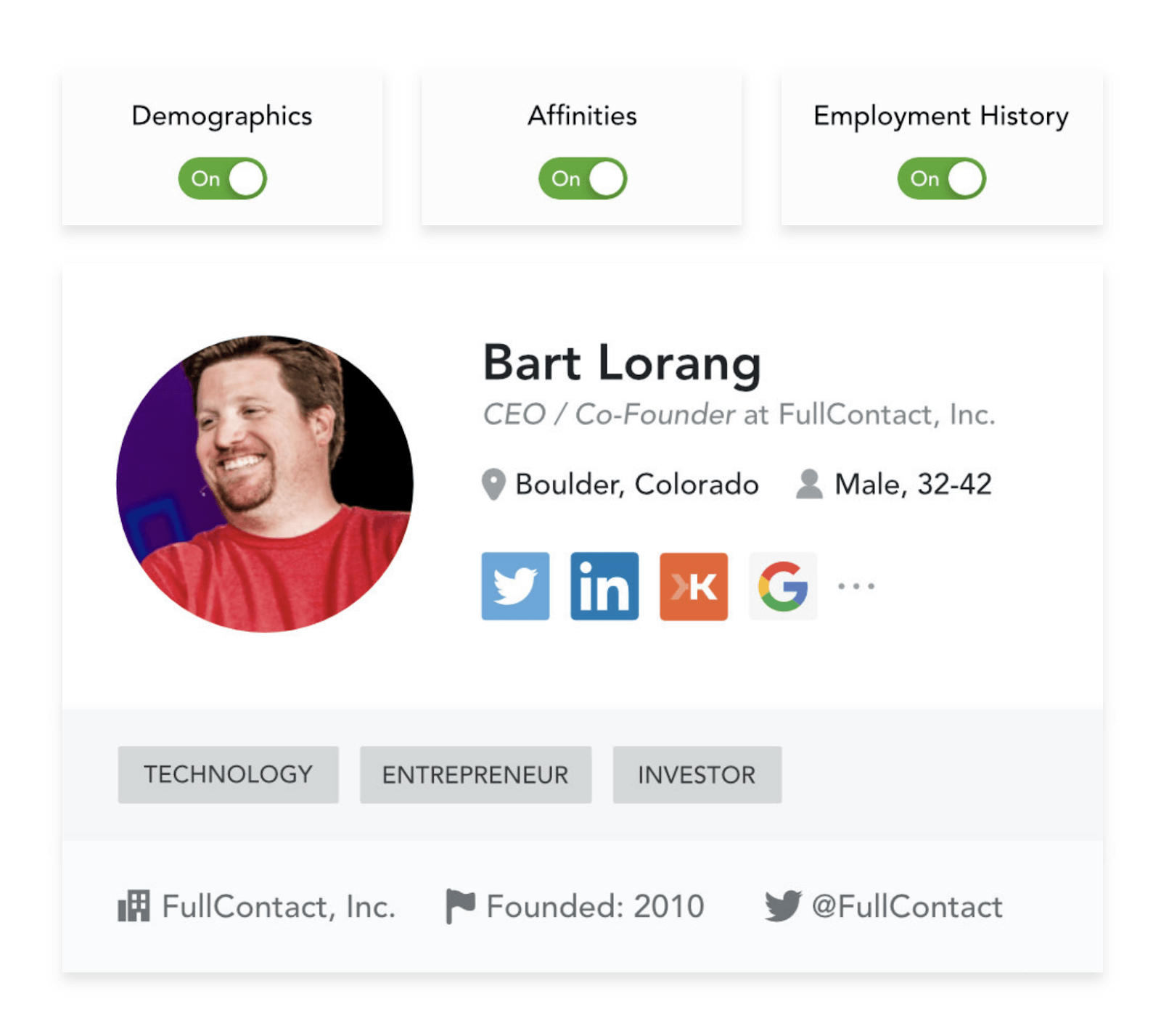 FullContact verbessert die Verkaufsakquise, indem es eine E-Mail-Adresse, einen sozialen Kontakt oder eine Telefonnummer in ein vollständiges Personen- oder Unternehmensprofil umwandelt, das Sie verwenden können, um Ihre Reichweite zu priorisieren und anzupassen.