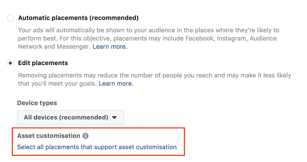 Wenn Ihr Creative nur auf einer der Platzierungen von Facebook gut aussieht, könnten Sie es verpassen, Ihre potenziellen Kunden auf den anderen zu erreichen. Glücklicherweise ermöglicht Ihnen Facebook jetzt, Ihr Creative für mehrere Platzierungen anzupassen.
