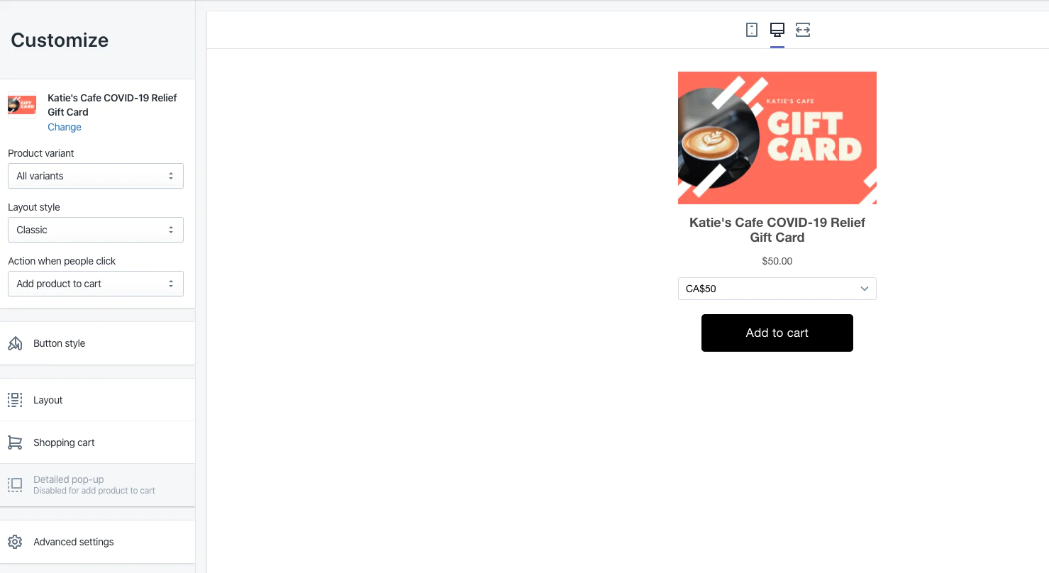 Wenn Sie eine bestehende Website haben, mit der Ihre Kunden vertraut sind, oder Ihre Geschenkkarten einfach nicht auf einer anderen Website verkaufen möchten, können Sie dies über den Buy Button-Kanal von Shopify tun.