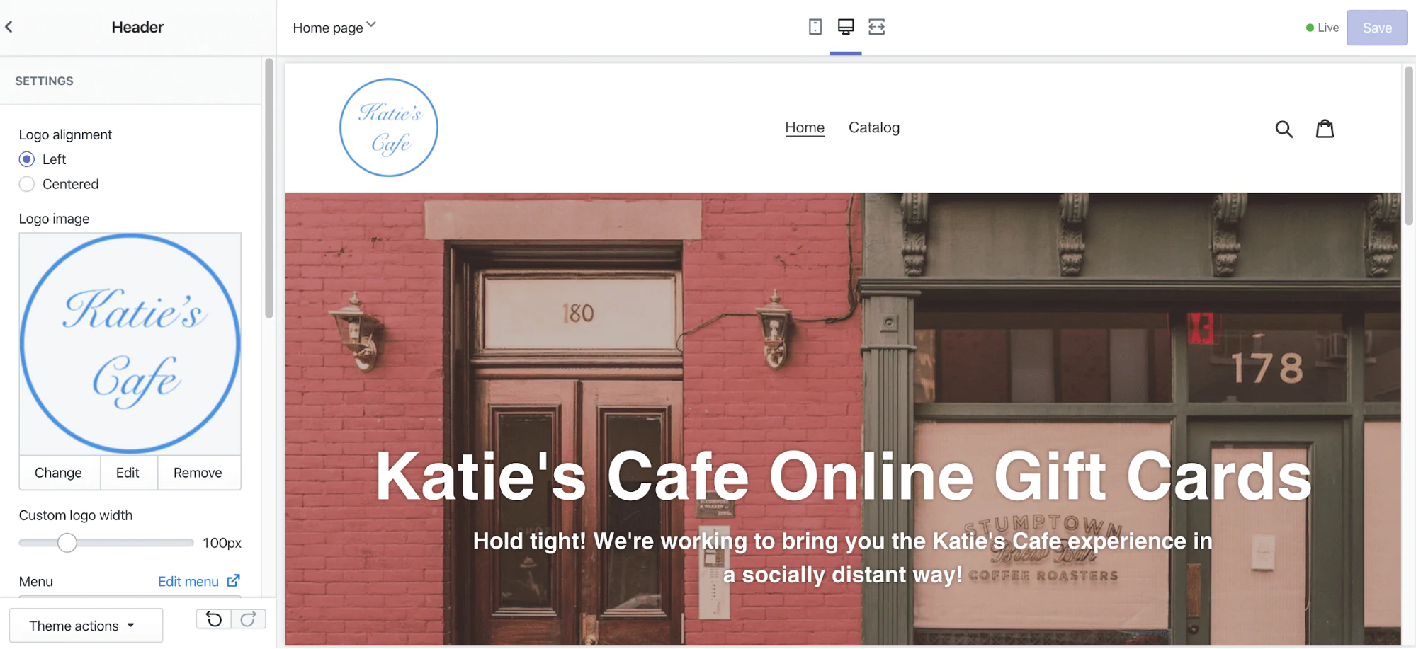 - Klicken Sie auf Kopfzeile , um den oberen Teil Ihres Online-Shops zu bearbeiten (wo Ihr Shop-Name steht). Hier können Sie Ihr Logo hinzufügen und andere Anpassungen speziell für Ihr Thema vornehmen. Klicken Sie auf den Zurück-Pfeil in der oberen linken Ecke, wenn Sie fertig sind.