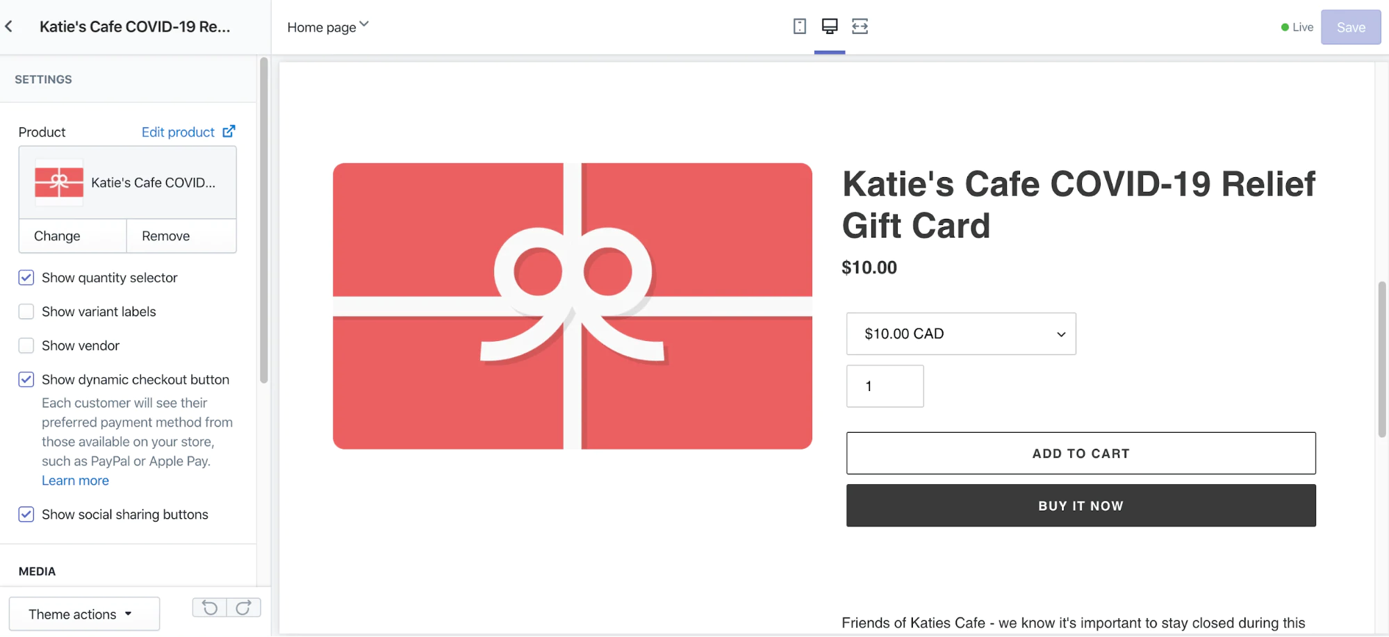 - Titel: Wie Ihr Produkt (Geschenkkarte) heißen wird. Ich habe meine „Katie’s Cafe COVID-19 Relief Gift Card“ genannt, um deutlich zu machen, was Kunden kaufen.