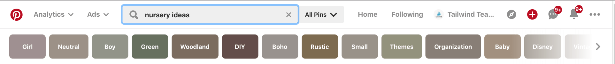Pinterest bietet uns mit seiner geführten Suchleiste ein großartiges Tool, mit dem Sie Ihre Keyword-Ideen erweitern können. Geben Sie einfach ein Stichwort wie „Kinderzimmerideen“ in die Suchleiste ein und drücken Sie die Eingabetaste.