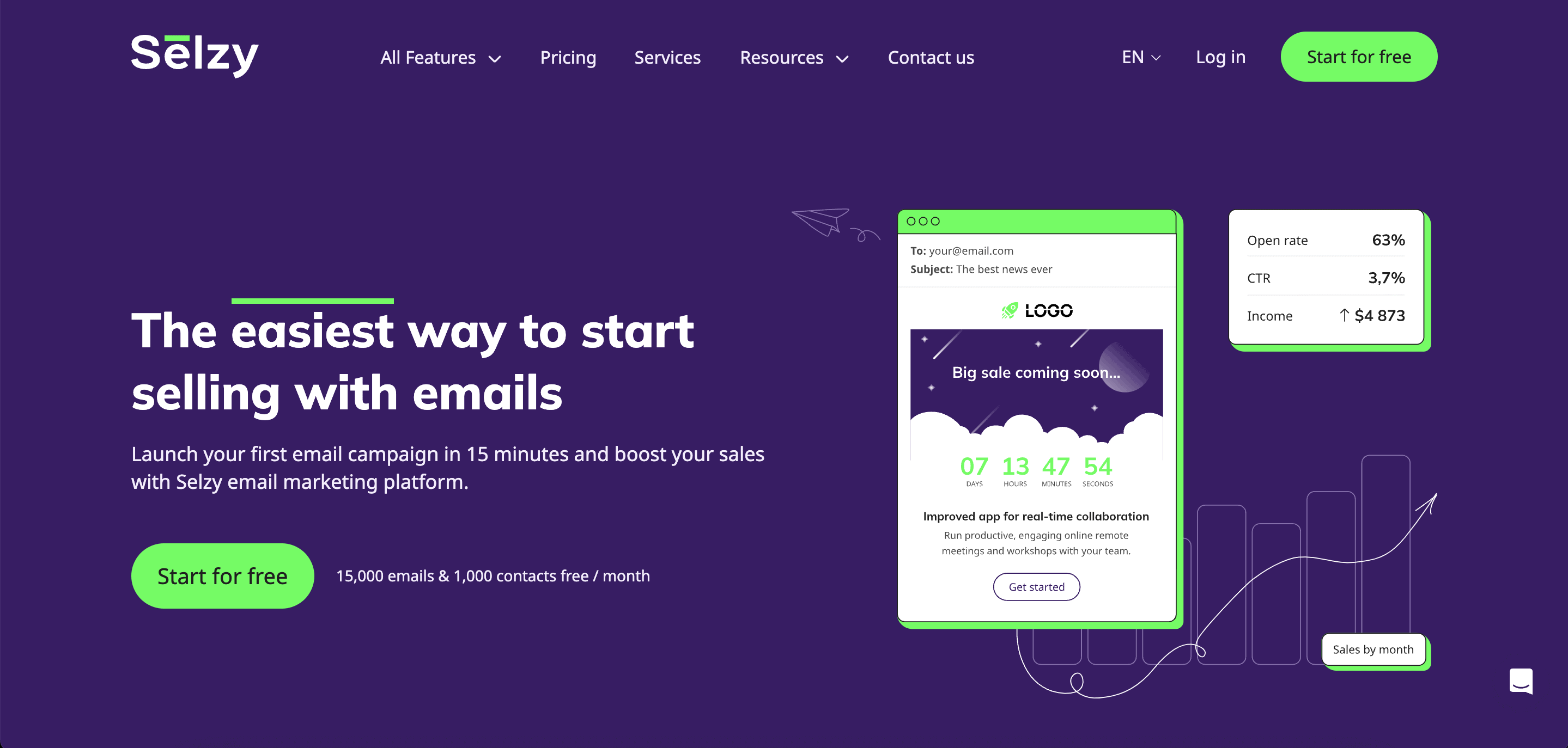 Mit Selzy können Sie bis zu 15.000 E-Mails pro Monat kostenlos über den Massen-E-Mail-Service versenden oder Ihre Kampagne mit der SMTP-API beschleunigen.