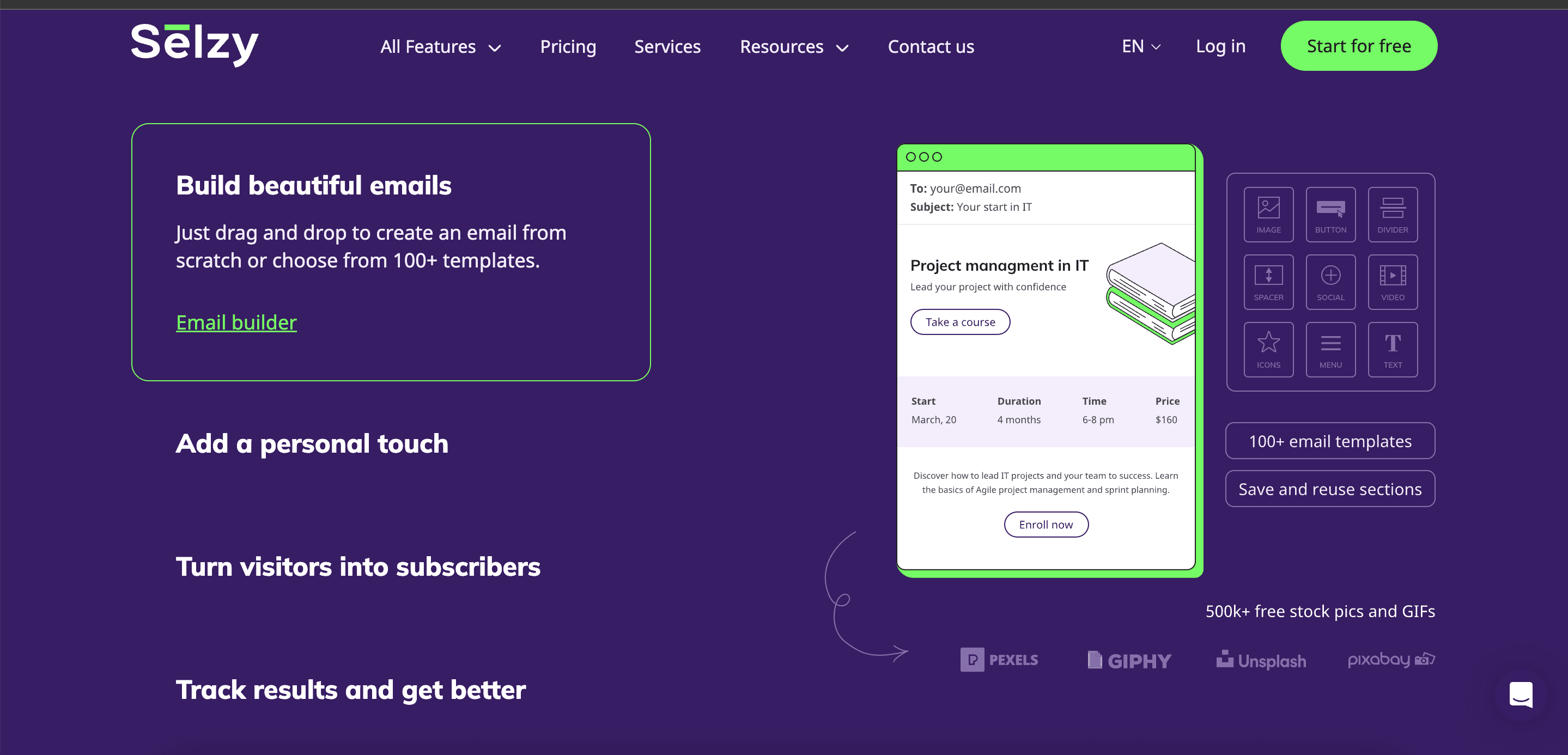 Mit Selzy können Benutzer personalisierte E-Mail-Kampagnen mit einem intuitiven E-Mail-Builder mit über 100 Vorlagen, über 300 GIFs und Stickern von GIPHY und über 500.000 kostenlosen Stock-Bildern von Unsplash, Pexels und Pixabay erstellen.