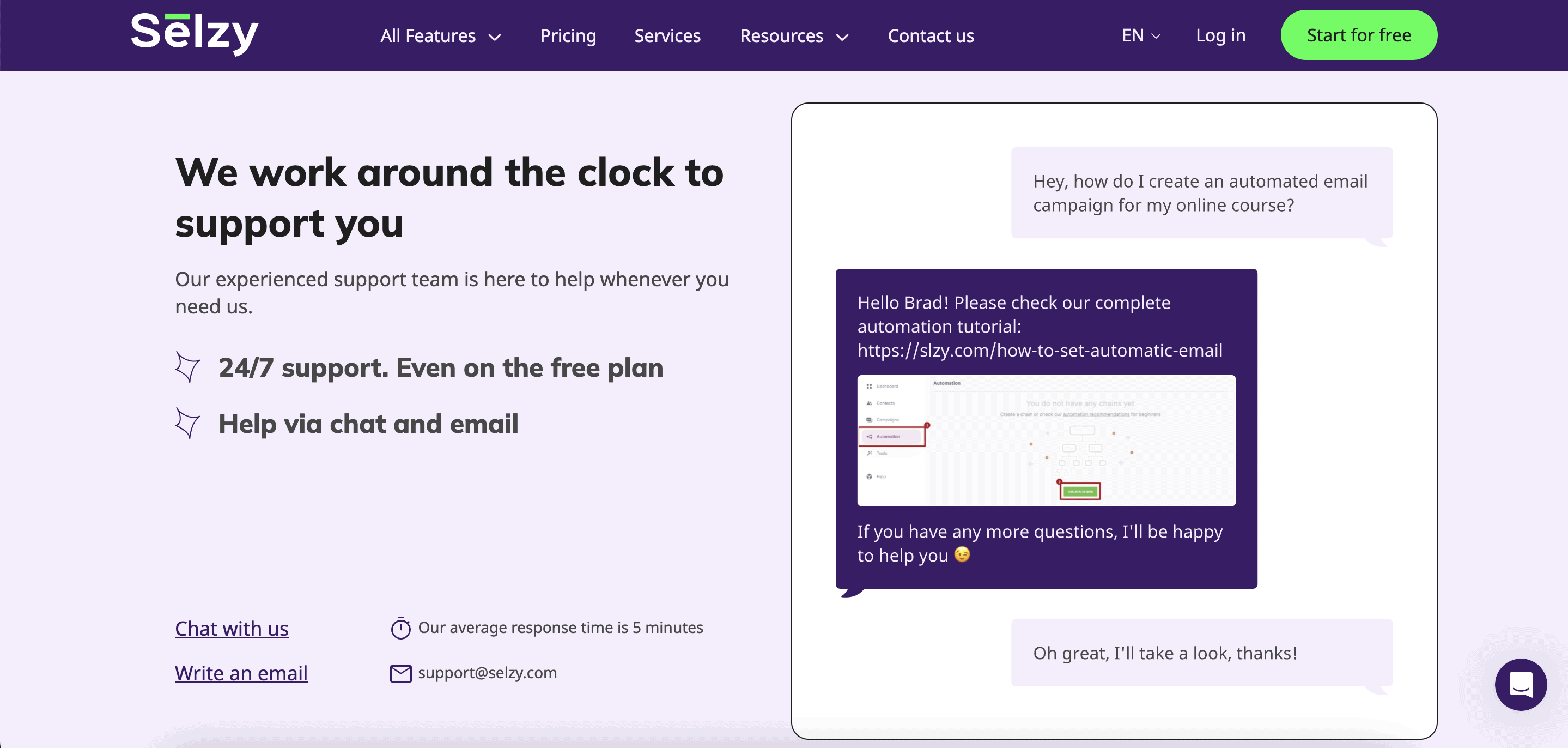 Und wenn Sie Hilfe benötigen, steht Ihnen das Support-Team von Selzy rund um die Uhr per Live-Chat, E-Mail oder Telefon zur Verfügung.