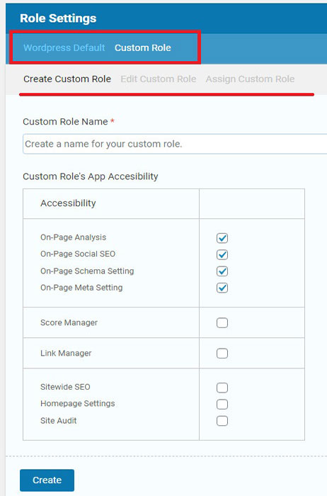 Die Registerkarte Rolleneinstellungen ist in den Abschnitt WordPress-Standard und benutzerdefinierte Rolle unterteilt. Die Option Rolleneinstellungen ist praktisch, wenn mehr als eine Person Ihre Site verwaltet. Sie können Ihren Teammitgliedern den Zugriff auf SEOPressor Connect einschränken oder gewähren .
