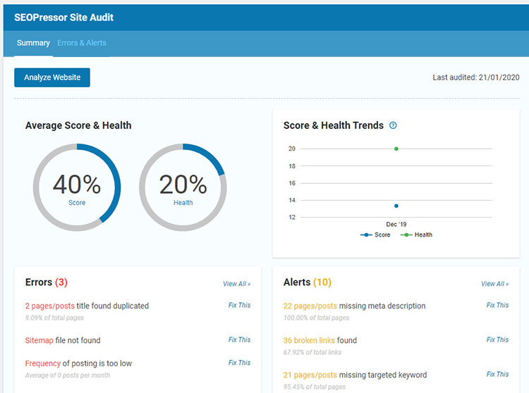 Klicken Sie auf ' Website analysieren ' für SEOPressor, um die Leistung Ihrer Website zu überprüfen . Es kann eine Weile dauern, bis diese Funktion die Leistung Ihrer Website gründlich überprüft, wenn sie viele Seiten hat.