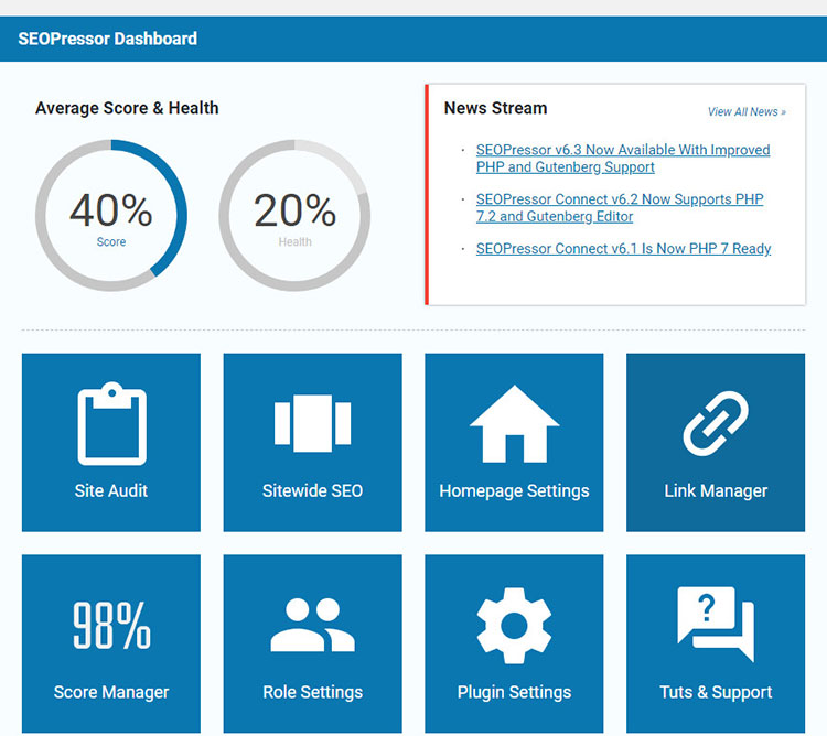 SEOPressor Connect erstellt nach der Installation ein eigenes Menü im WordPress-Dashboard. Es stehen acht Optionen zur Auswahl : Site Audit, Sitewide SEO, Homepage-Einstellungen, Link-Manager, Score-Manager, Rolleneinstellungen, Plugin-Einstellungen und Tuts & Support.