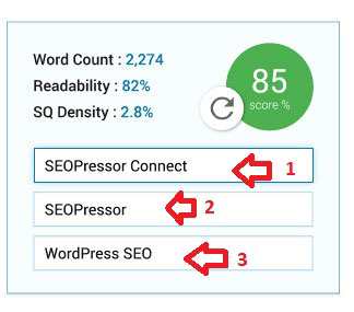 SeoPressor Connect ermöglicht es Ihnen, mindestens drei Keywords pro Post anzusprechen und deren Verwendung zu analysieren, um einen SEO-Prozentwert zu berechnen. Der SEO-Score Ihres Beitrags wird in großen, freundlichen Buchstaben mit einem prozentualen Betrag angezeigt.
