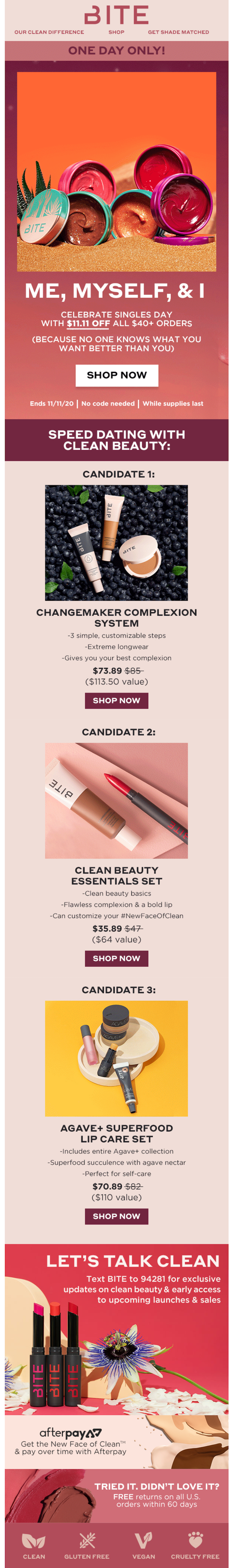Im Jahr 2020 ging Bite Beauty über einen Rabatt auf ihre Produkte für den Singles' Day hinaus. Sie haben Produktpakete als Speed-Dating-Kandidaten neu erfunden. Wenn Sie Humor verwenden, um sich auf die Erfahrungen einzelner Personen zu beziehen, fühlt sich die E-Mail relevanter und einprägsamer an.