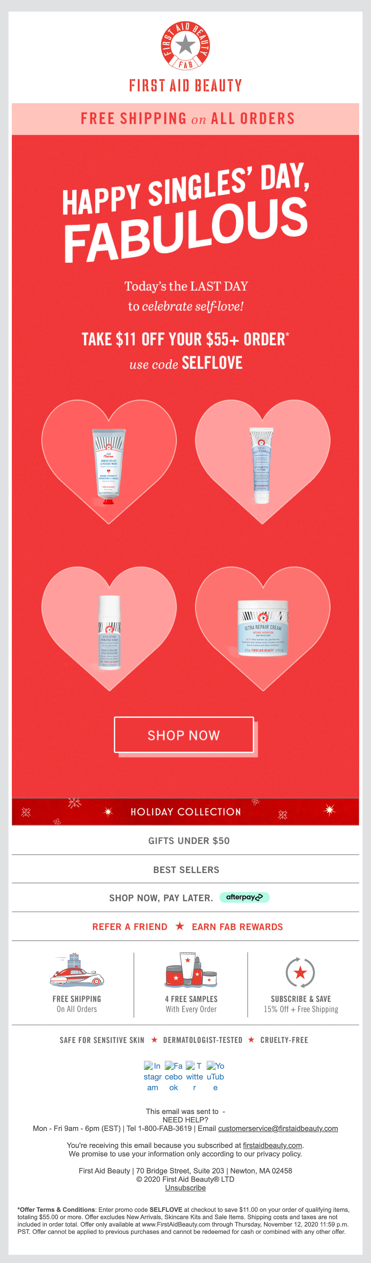 Nur weil der Singles' Day ein „Anti-Valentinstag“ ist, heißt das nicht, dass Marken keine Herzen und Liebe gebrauchen können. First Aid beginnt ihre E-Mail mit einem fetten "Happy Singles' Day, Fabulous" und fordert die Kunden dann auf, den Code "SELF LOVE" zu verwenden, um 11 USD bei einer Bestellung von 50 USD oder mehr zu sparen. Das Thema der Nummer 11/11 oder 11.11 taucht immer wieder in Singles' Day E-Mails auf.