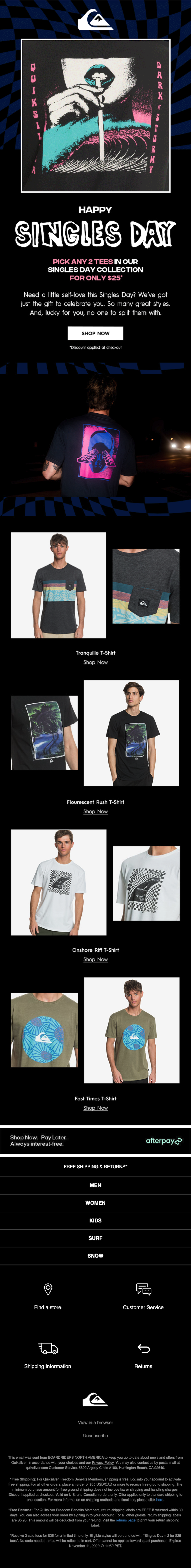 Quiksilver glaubt, dass es seine Vorteile hat, Single zu sein. Nämlich – nicht Ihre Lieblings-T-Shirts teilen zu müssen. Die Singles' Day-Marketingkampagne des Unternehmens bot zwei Hemden für 25 US-Dollar an, was bedeutet, dass Sie eines für sich und ein weiteres für ... Sie bekommen.