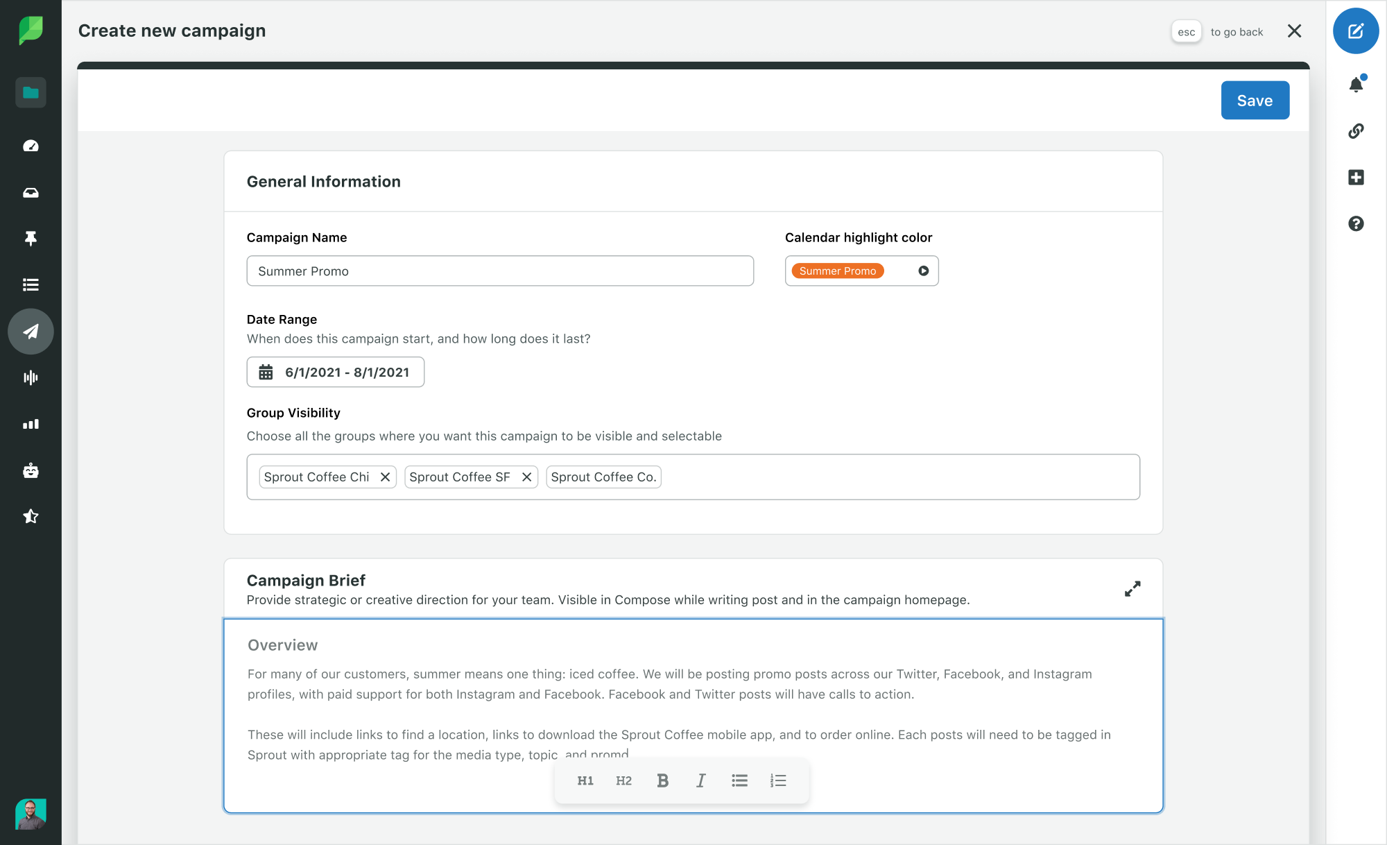 Verwenden Sie eine Social-Media-Verwaltungsplattform wie Sprout, um Ihre Kampagne organisiert zu halten – von der Ideenfindung über die Erstellung von Inhalten bis hin zur Auswertung Ihrer Kennzahlen. Mit den Funktionen des Kampagnenplaners von Sprout können Sie alles, was Sie für die Durchführung einer erfolgreichen Kampagne benötigen, an einem Ort erstellen, einschließlich Briefings, kreative Assets und Analyseberichte.