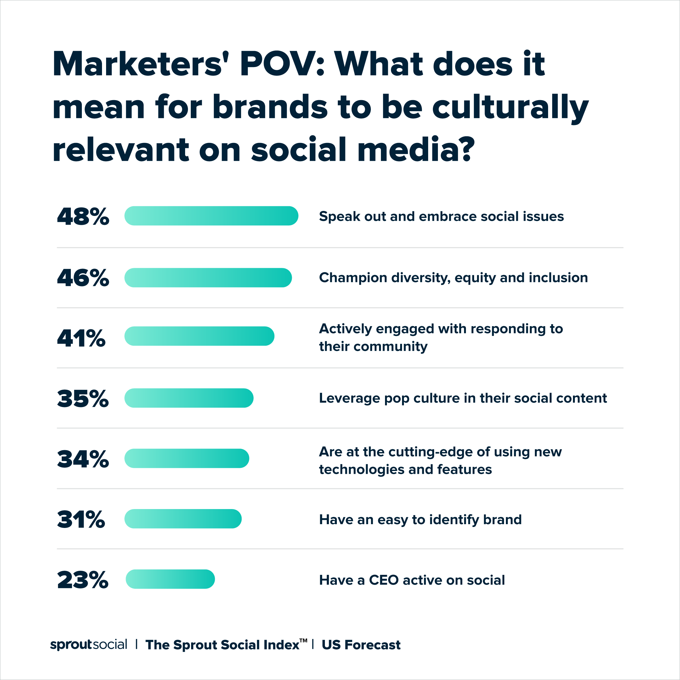 Den Daten des Index 2022 zufolge halten es die meisten Verbraucher (71 %) für wichtig, dass Marken das Bewusstsein schärfen und zu sozialen Themen Stellung beziehen. Auch wenn es schwierig sein kann, sensible Ereignisse anzusprechen, stimmt fast die Hälfte der Vermarkter zu, dass Marken über soziale Themen sprechen müssen, um in den sozialen Medien relevant zu bleiben.