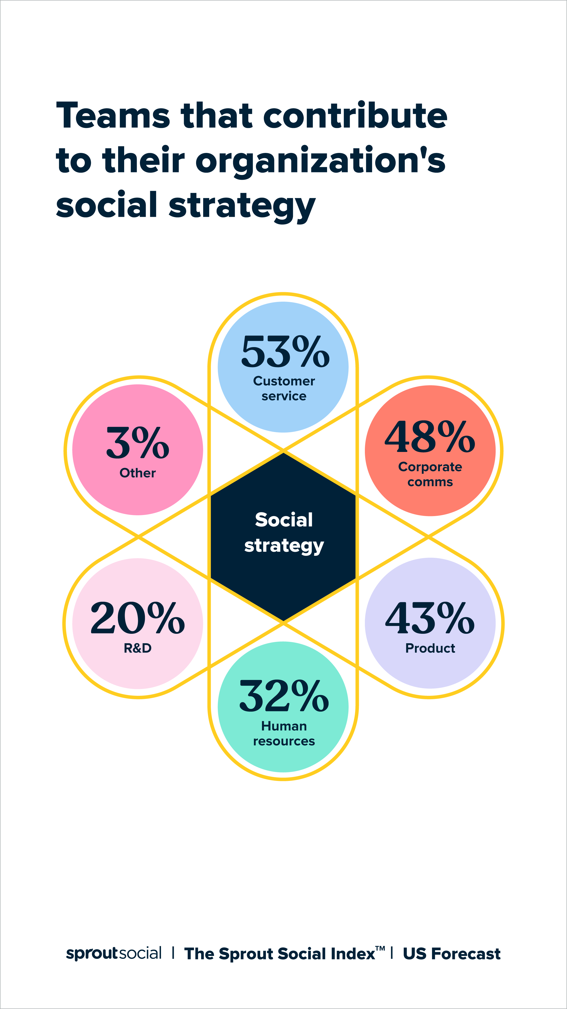 Während der Ideenfindungsphase Ihrer Social-Media-Kampagne ist es unerlässlich, sich mit Teams aus anderen Unternehmensfunktionen zu beraten, um sicherzustellen, dass Sie Ihre Kunden, Ihre Produkte und Ihre Wettbewerbslandschaft vollständig verstehen. Der Sprout Social Index 2022 hat gezeigt, dass die sozialen Strategien vieler Unternehmen bereits von Teams außerhalb des sozialen Bereichs beeinflusst werden – darunter Kundenservice, Unternehmenskommunikation, Produktentwicklung, HR, F&E und Vertrieb.