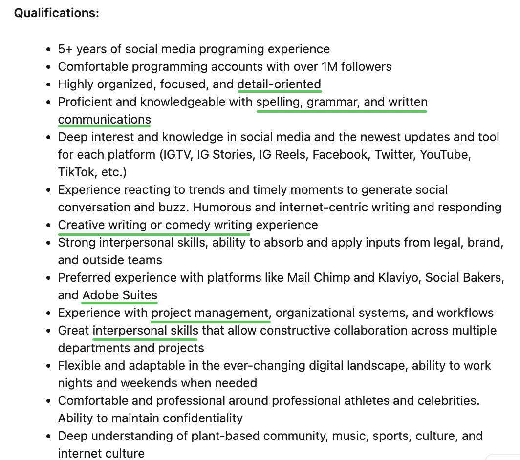 Werfen Sie einen Blick auf einige harte und weiche Fähigkeiten, die wir in einer Position als Social Media Manager bei Beyond Meat identifiziert haben:
