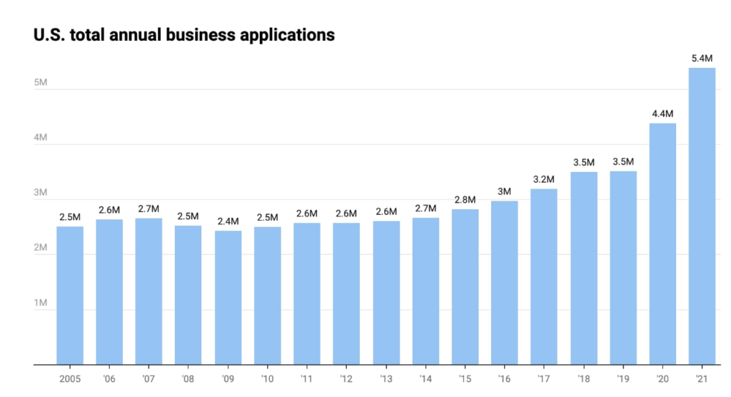 Aber wie Sie dem obigen Bild entnehmen können, ist dieser Durchschnitt seit Beginn der Pandemie dramatisch gestiegen. Tatsächlich gab es im Jahr 2021 in den USA 5,4 Millionen neue Geschäftsanträge, was der höchste Wert aller Jahre und eine Steigerung von 53 % gegenüber 2019 war.