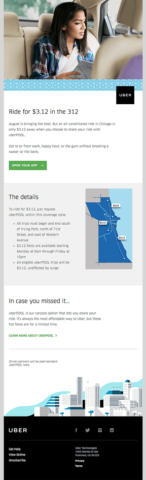 Diese Segmentierung berücksichtigt die Geolokalisierungsparameter des Empfängers. Die Segmentierung nach Städten ist der klassischste Typ. Für viele Unternehmen ist dies der Schlüssel zur Auswahl von Empfängern, die geografisch an dem Angebot interessiert sind. Aber es gibt noch viele andere: Nation, Stadt, Region, Sprache, Klima und Markt. Hier ist ein gutes Beispiel für eine geografisch segmentierte Chicago-Kampagne von Uber: