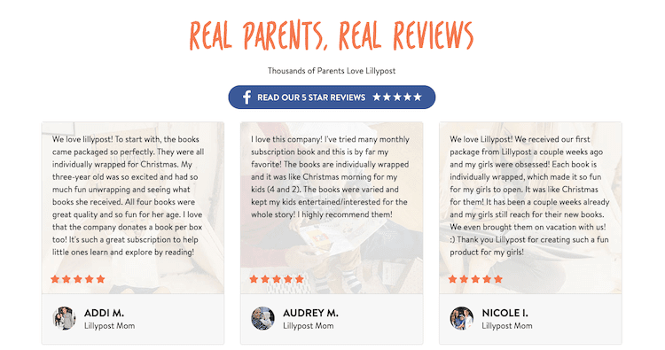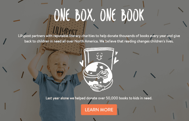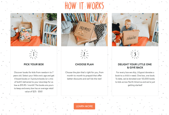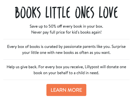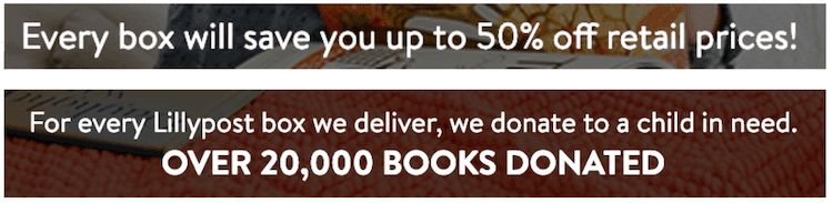 Sie bleiben bei Lillypost und nutzen weiterhin die bereits erwähnte emotionale Anziehungskraft. Ja, das Produkt wird den Kindern schon dadurch zugute kommen, dass sie 3-4 brandneue Bücher erhalten, aber Lillypost macht deutlich, wie sich dies auch auf die Eltern auswirkt. Denken Sie an all die Streicheleinheiten und das Lernen / Lehren, die Sie zusammen erleben werden – Stichwort Wärme und Fuzzies. Zusätzlich zu diesen persönlichen Vorteilen leistet Lillypost großartige Arbeit, indem es die finanziellen Vorteile hervorhebt und wie diese anderen zugute kommen.
