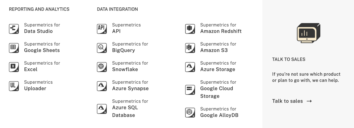 - Data Warehouses – Supermetrics für BigQuery, Supermetrics für Snowflake, Supermetrics für Azure Synapse, Supermetrics für RedShift, Supermetrics für Azure SQL-Datenbank, Supermetrics für Google AlloyDB