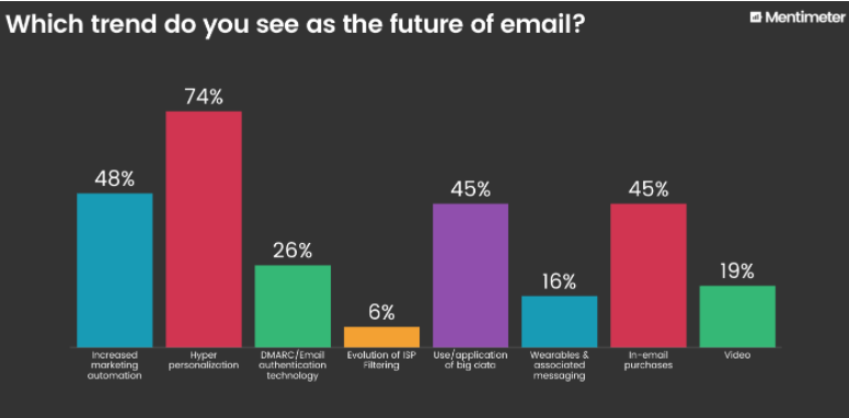 Wie ich bereits erwähnt habe, mag ich Daten und mehr Beweispunkte. Während unserer „Send With Confidence“-Tour in Europa stellte ich unserem Publikum dieselbe Frage: „Was glauben Sie, wie die Zukunft des E-Mail-Marketings aussehen wird?“ So haben sie, Personen, die unsere Plattform zum Versenden von E-Mails nutzen, und andere neugierige Personen, die an unserer Veranstaltung teilgenommen haben, die Frage beantwortet: