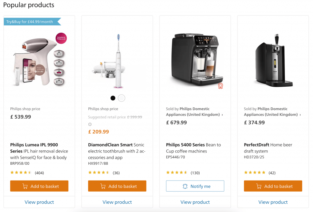 In Zusammenarbeit mit den Experten für Wachstumsmanagement von Insider nutzte Philips den KI-gestützten Smart Recommender von Insider um stark kontextbezogene Produktempfehlungen zu liefern. Benutzern auf einer Produktseite werden relevante Produktempfehlungen basierend auf früheren Verhaltensdaten und Benutzerpräferenzen angezeigt.