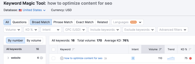 Sie können mit einem Thema beginnen, das Sie im Sinn haben, indem Sie mit einem Tool wie Semrush Suchvolumina zu bestimmten Schlüsselwörtern abfragen. Oder Sie können nach einem bestimmten Thema suchen, indem Sie die Möglichkeiten mit Ihrem bevorzugten Keyword-Recherche-Tool erkunden.