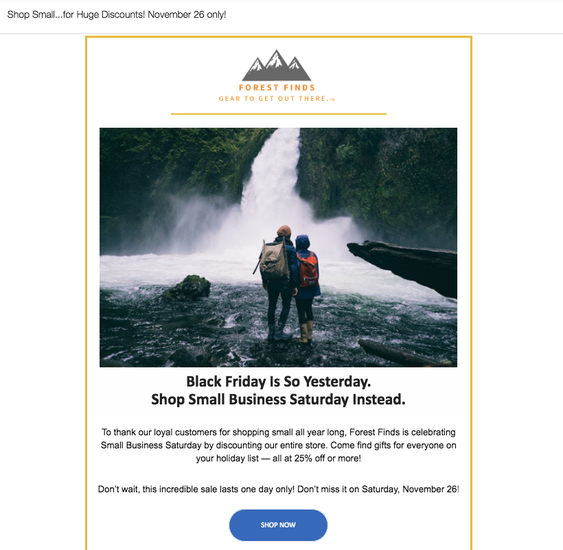 Hier sind einige E-Mail-Beispiele, die wir 2016 für die Small Business Saturday-Inspiration erstellt haben. Lassen Sie sich davon motivieren – oder ermutigen Sie Sie, noch besser zu werden. (Vergessen Sie nur nicht, dass Small Business Saturday dieses Jahr auf den 24. November fällt, nicht auf den 26.!)