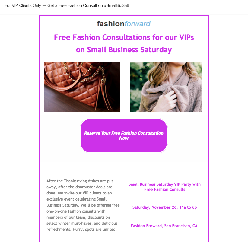 - Senden Sie eine zweite Erinnerung am Black Friday oder sogar sehr früh am Small Business Saturday selbst. Dies ist besonders wichtig, wenn Ihr Geschäft normalerweise samstags nicht geöffnet ist.
