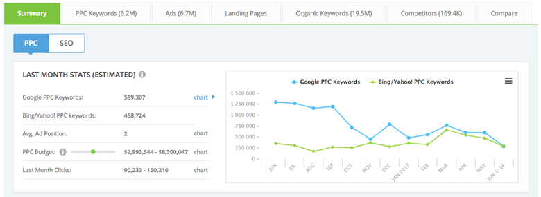 Diese Website nutze ich regelmäßig, aber mit absoluter Vorsicht, da ich in der Vergangenheit einige ungenaue Verkehrs- und Budgetzahlen gemeldet habe. Es bietet jedoch ziemlich spezifische Informationen zu Keywords, auf die Ihre Konkurrenz bietet und mit denen sie den größten Erfolg erzielt. Außerdem können Sie die tatsächlichen Anzeigenkopien anzeigen, die möglicherweise erst im Vormonat geschaltet wurden. Und das ist nur in der kostenlosen Version! Geben Sie einfach die Webadresse eines Ihrer Mitbewerber ein und Sie sehen das geschätzte monatliche AdWords-Budget, bezahlte Keywords, bestbezahlte Mitbewerber, Anzeigenposition, Klicks pro Tag, Keywords und Anzeigentexte.
