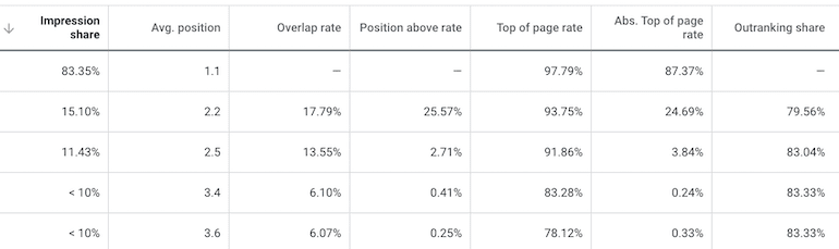 Ein weiteres wichtiges Detail finden Sie in der Outranking-Aktie. Diese Kennzahl zeigt Ihnen, wie oft Sie die Konkurrenz übertreffen, wenn Sie in derselben Auktion erscheinen. In den obigen Auction Insight-Ergebnissen können wir sehen, dass es keinen großen Unterschied zwischen den drei Positionen über uns gibt, die darauf hindeuten, dass die Gebote nahe beieinander liegen. Diese Daten weisen darauf hin, dass geringfügige Gebotserhöhungen unsere durchschnittliche Position erhöhen könnten, und es könnte einen Test wert sein, ob eine verbesserte durchschnittliche Position auch den ROAS erhöht.