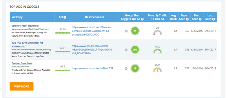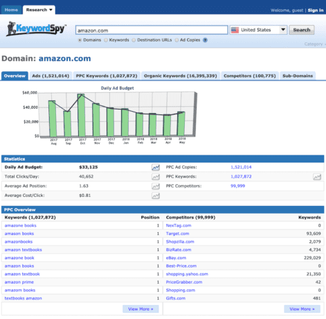 Im Wesentlichen können Sie innerhalb der iSpionage-Benutzeroberfläche die Top-Keywords, Top-Anzeigen, Top-Landingpages und eine Liste der Mitbewerber überprüfen. Diese Daten können Ihnen sicherlich dabei helfen, Keyword-Lücken in Ihren Google- oder Bing-Kampagnen zu identifizieren.