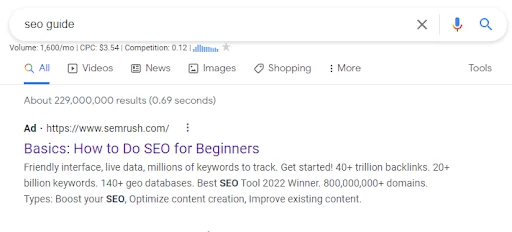 Zum Beispiel ist Semrush eine SEO-SaaS, die PPC-Anzeigen für das Schlüsselwort „SEO-Leitfaden“ betreibt.
