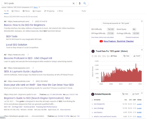 Unten finden Sie eine Suche nach „SEO-Leitfaden“ mit Keywords Everywhere. Es zeigt Trenddaten, Ranking-Schwierigkeit, verwandte Keywords und Konkurrenz für Ihren Begriff an.