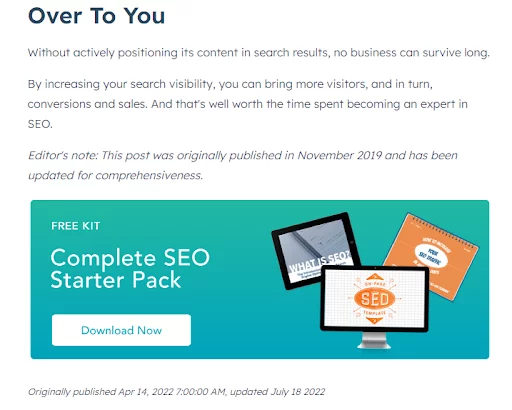 Sie können Inhalts-Upgrades überall in Ihrem Guide einfügen. Unten fügt HubSpot sein SEO-Starterpaket am Ende seines Leitfadens hinzu: