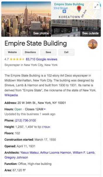 Für eine bekannte Einrichtung wie das Empire State Building können Sie ein wirklich reichhaltiges Wissensdiagramm sehen, das grundlegende Informationen, Adressen, Öffnungszeiten, Stoßzeiten, Rezensionen und sogar aktuelle Nachrichten enthält.