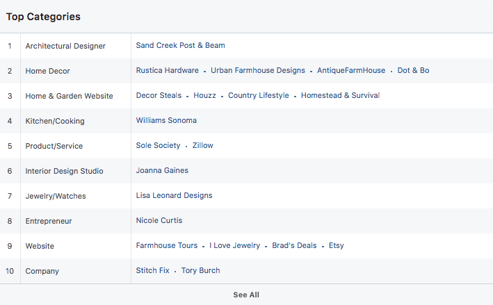 Navigieren Sie als Nächstes zum Dashboard „Seiten-Likes“ und sehen Sie sich die Abschnitte „Top-Kategorien“ an, um eng verwandte Wettbewerber zu entdecken, die auch auf Facebook prominent zu finden sind. Wenn Sie nach unten scannen, sehen Sie möglicherweise einige bekannte Namen. Aber höchstwahrscheinlich werden Sie eine Reihe von Unternehmen sehen, von deren Existenz Sie nicht einmal wussten, dass sie attraktiv und relevant sind und mit Ihren Zielkunden interagieren. Einige von ihnen werden Ihre direkte Konkurrenz sein, während andere Orte sind, an denen Ihre Kunden Inhalte konsumieren.