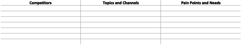 Beginnen Sie damit, all dies in Ihrer Tabelle oder Ihrem Papier zu dokumentieren. Unterteilen Sie es in drei Kategorien – Konkurrenzforschung, Nischenthemenforschung sowie Kundenprobleme und -bedürfnisse:
