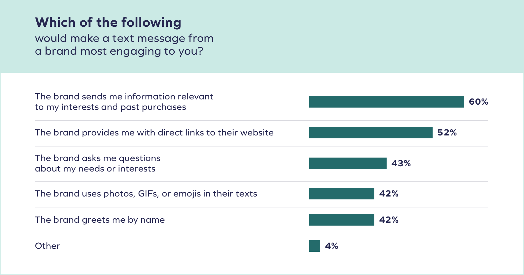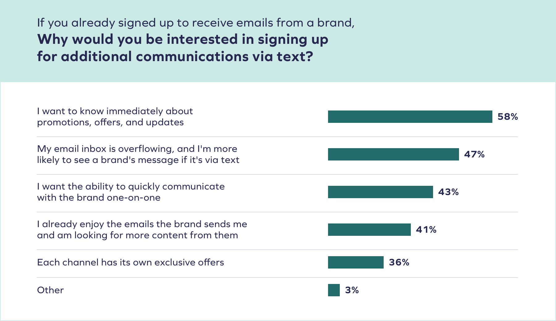 Dieses Gefühl der Aktualität führt viele Verbraucher dazu, sich für den Erhalt von Texten einer Marke zu entscheiden. Laut Daten von Yotpo würden sich über 58 % der Verbraucher für SMS-Marketingnachrichten einer Marke anmelden , um sofort über Werbeaktionen, Angebote und Updates informiert zu werden, selbst wenn sie bereits E-Mails derselben Marke erhalten.