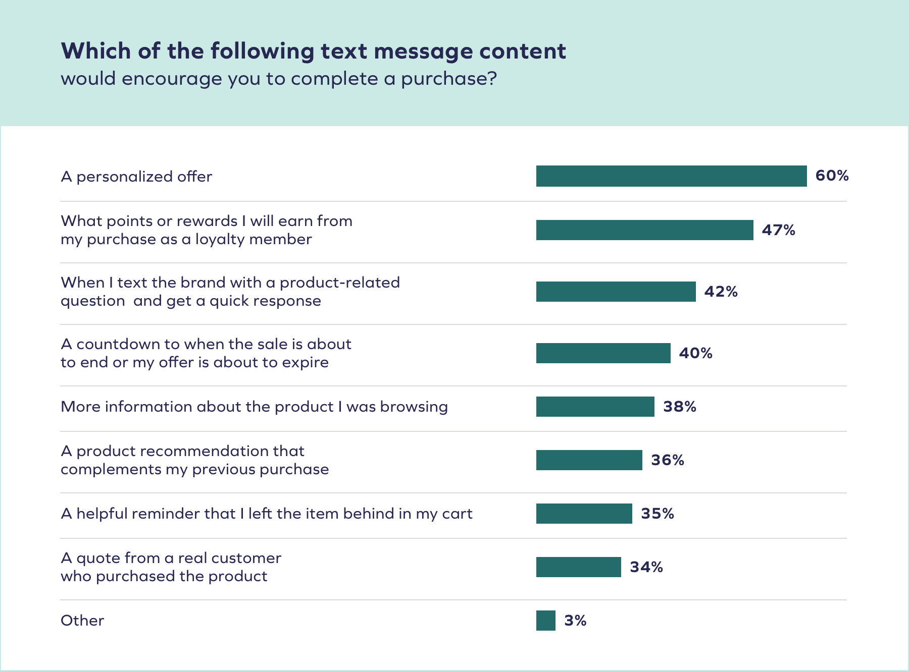 Darüber hinaus kann Ihre Marke Treuedaten verwenden, um Ihre Texte zu personalisieren, um das Engagement zu erhöhen. Lassen Sie VIP-Mitglieder, die kurz vor dem Aufsteigen stehen, oder laden Sie neue Mitglieder zu einem Quiz ein, um zusätzliche Punkte zu erhalten. Mehr als 47 % der Verbraucher gaben an, dass eine SMS über ihre Treuepunkte oder Prämien sie zum Kauf animieren würde – und je personalisierter die Nachricht, desto höher wird diese Zahl.