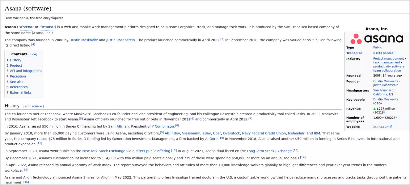 Nehmen Sie sich eine Minute Zeit, um die Wikipedia-Seite von Asana anzusehen. In ihrem Fall haben sowohl das Unternehmen als auch seine Software denselben Namen. Sie sind aber sehr geschickt mit der Situation umgegangen und haben das im zweiten Satz explizit gesagt.