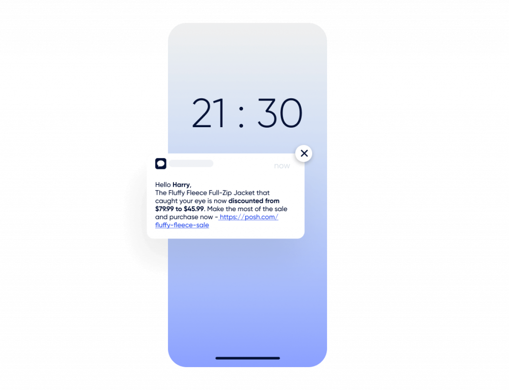 Wenn der Preis der Jacke einige Wochen später sinkt, benachrichtigt die Marke den Kunden umgehend per personalisierter SMS. Die Botschaft bringt die Jacke wieder auf den Radar des Kunden und zeigt ihm, dass die Marke auf seine Budgetbeschränkungen achtet. Berührt von diesem Maß an persönlicher Betreuung und begeistert über den Preisverfall, schnappt sich der Kunde die Jacke und festigt so seine Bindung zur Marke.
