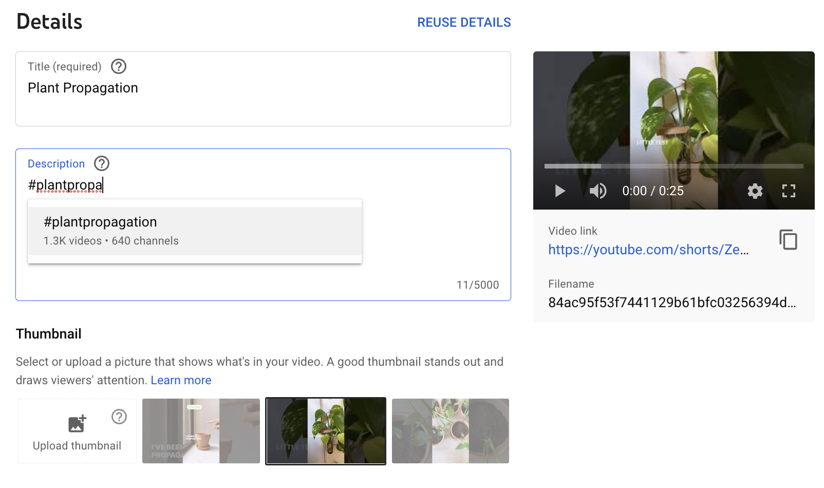 - Hashtags: Wenn Sie Hashtags in Ihre Beschreibung eingeben, zeigt Ihnen YouTube, wie beliebt ein Hashtag ist, was Ihnen helfen kann, beliebte Themen und Nischenthemen zu identifizieren, für die Sie einen Rang einnehmen möchten.