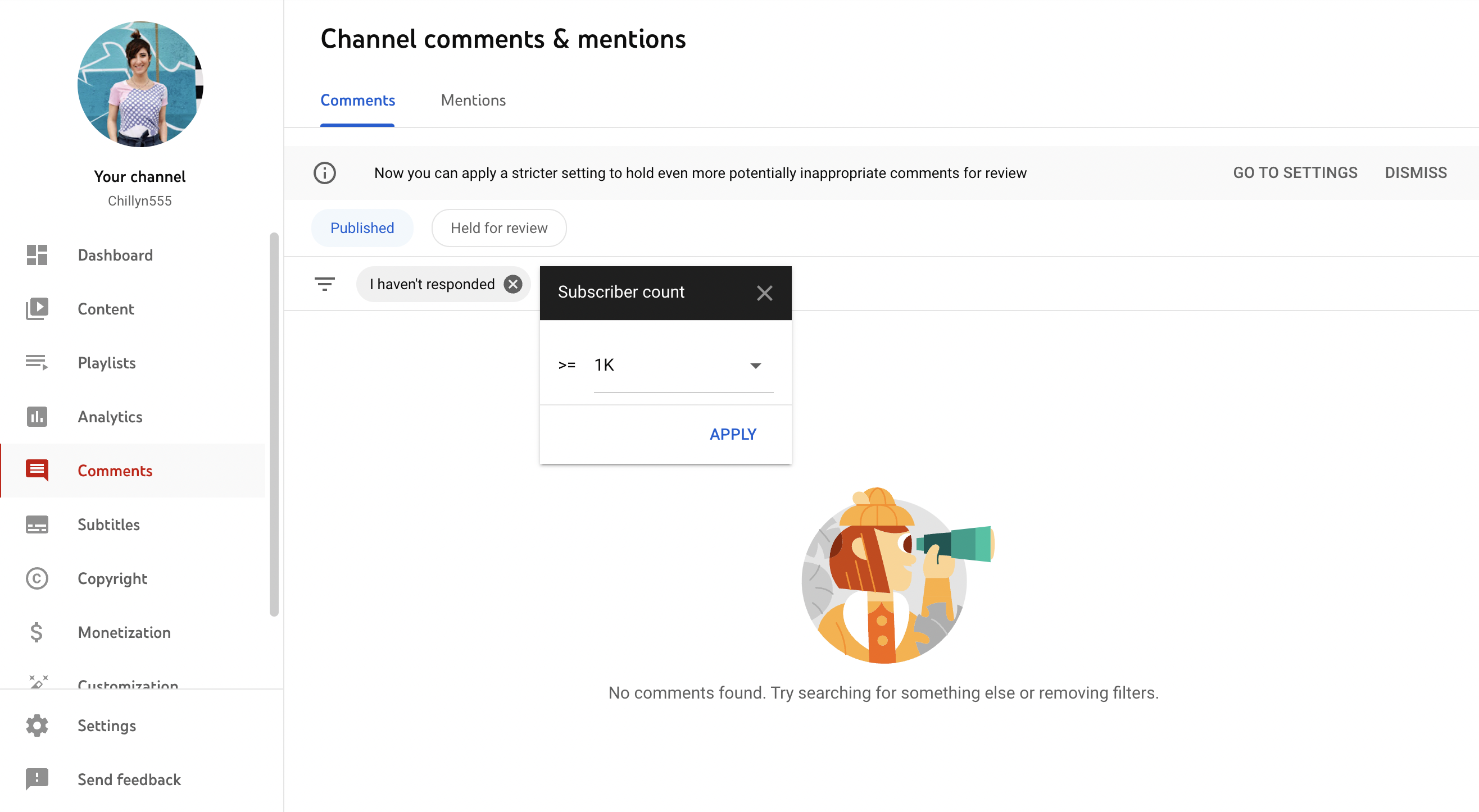 Gehen Sie dazu zu YouTube Studio > Tab "Analytics" > Kommentare . Im Screenshot unten sehen Sie einige Möglichkeiten, wie Sie Kommentare filtern können.