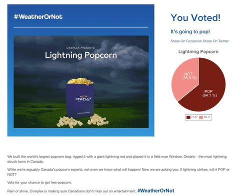 Los participantes podían votar si pensaban que un rayo caería sobre la bolsa y haría estallar el maíz. Cineplex ofreció palomitas de maíz gratis para los ganadores, mientras que The Weather Network logró convertir el clima en un tema con un atractivo masivo.