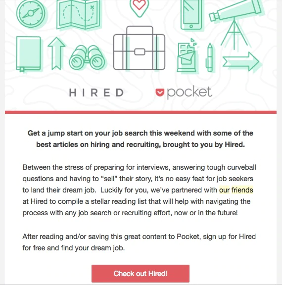 Con un correo electrónico, Hired pudo exponer una lista ya establecida de nuevos usuarios potenciales para su servicio y Pocket pudo aplicar su producto en un caso de uso de la vida real con una lista de lectura seleccionada.