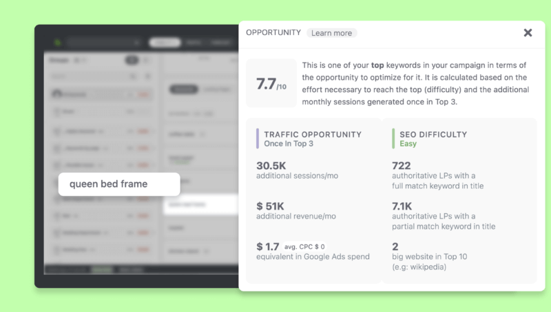 Por ejemplo, un minorista de moda recién lanzado podría querer apuntar a "vestidos negros", pero necesita luchar contra gigantes como H&M o ASOS. Pasar la palabra clave a través de un sistema métrico de dificultad probablemente indicaría que es un esfuerzo difícil y sería una pérdida de recursos competir allí ahora.