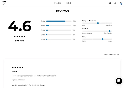 Un vendedor de ropa de gimnasia, Gymshark, incluye reseñas de clientes en cada página de producto. También muestra un sistema de calificación para que los compradores puedan obtener información del producto de forma rápida y sencilla.