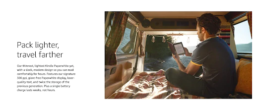 La palabra firma le da al lector la impresión de que se trata de algo especial. Amazon continúa citando la densidad de píxeles (300 ppp) y cómo el lector tiene una pantalla sin reflejos y el doble de almacenamiento que las generaciones anteriores.